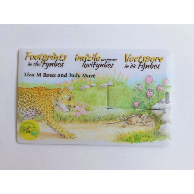 This card style, 16GB, Cape Leopard Trust branded USB drive, comes preloaded with the Footprints in the Fynbos audiobook set.