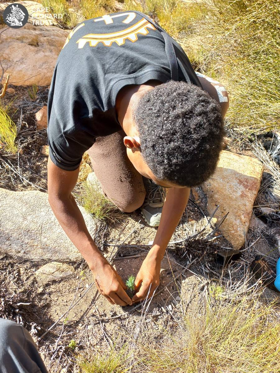 Then came the time to plant cedar trees – 20 fragile saplings that they had carried with from the start of the trail to a suitably high and rocky area. The Clanwilliam Cedar, critically endangered and struggling to survive, mirrored the vulnerability of the environment—and, in many ways, their own communities. As they planted the saplings, one of the boys stood back, quietly proud: “I feel like I’m leaving something behind. Something that matters. I’ll call this tree Simba, and hopefully it’ll grow to become Mufasa” he said softly. The focus of the trek had shifted from merely completing a hike, to taking responsibility for something bigger than themselves. With every sapling they placed into the soil, they contributed to the future of these mountains, a physical act of nurturing the land that would continue to grow long after they’d left.